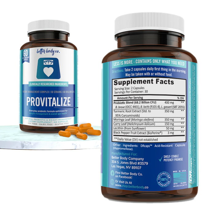 Provitalize is a probiotic supplement designed by BB Company for women, especially those over 40, to support gut health, hormonal balance, metabolism, and menopause-related weight gain using ingredients like turmeric, moringa, and curry leaf.